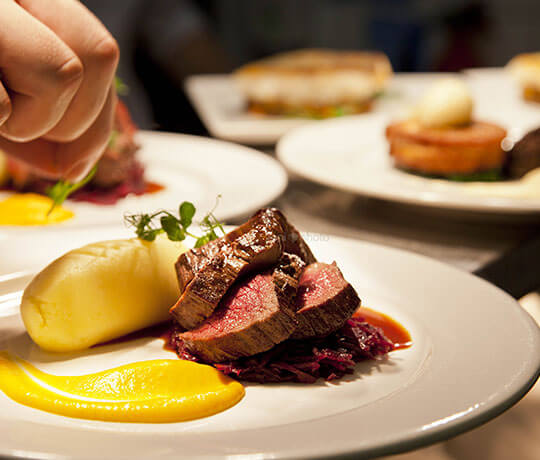 Меню ресторана состоит из лучших блюд европейской и национальной кухни, а широчайший выбор десертов, молочных коктейлей удовлетворит требования самого взыскательного посетителя. Если же Вам захочется что-нибудь экзотическое, отсутствующее в меню, наш повар с радостью исполнит Ваш кулинарный каприз.